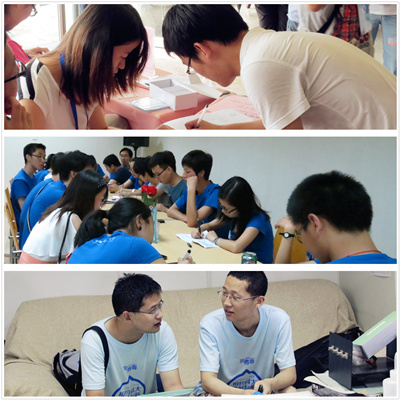 早在正式开营的半个月前,来自学院和微尺度实验室的35名学生志愿者,就已经开始有条不紊地着手准备工作。在这些志愿者中,有些曾经是夏令营的营员,期待将自己当初情定科大的经历与学弟学妹们分享;有些则是热衷志愿服务事业,希望能通过自己的努力为志向来科大的学生提供最贴心的帮助。从会前向每一位营员确定报道事宜,到每场报告为大家准备矿泉水,再到营员们每一声充满信任的“组长”,哪儿有营员,哪儿就有他们忙碌的身影,就有他们无微不至的关怀。