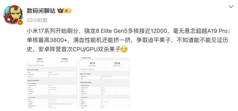 小米17系列开始刷分,骁龙8 Elite Gen5多核接近12000,毫无悬念超越A19 Pro;单核最高3800+,满血性能机还能挤一挤,争取追平果子,不知道能不能见证历史,安卓阵营首次CPU/GPU双杀果子