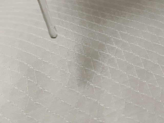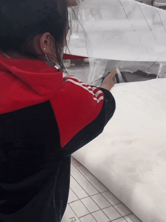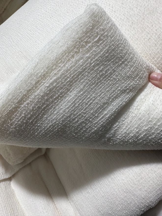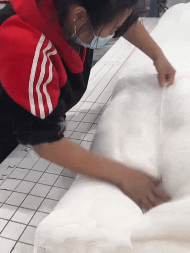 做成半成品的纯棉被衬反面铺开,铺上棉胚,用加粗加密的网纱罩住,(隔绝棉纤维之间黏连,让我们使用过程中不跑棉 、不漏棉)。