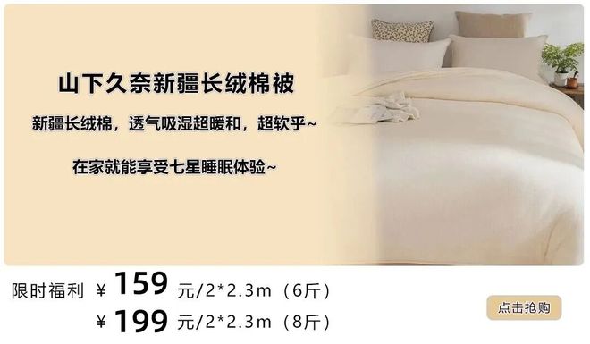 这床山下久奈棉在保暖、透气、柔软各方面和鹅绒被相媲美,没有中间商!没有多余的品牌溢价!用的还是实实在在的100%新疆长绒棉!